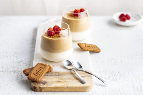 Una deliciosa panna cotta con un toque de Biscoff. Una capa clásica de vainilla rematada con una capa de delicias de Biscoff.